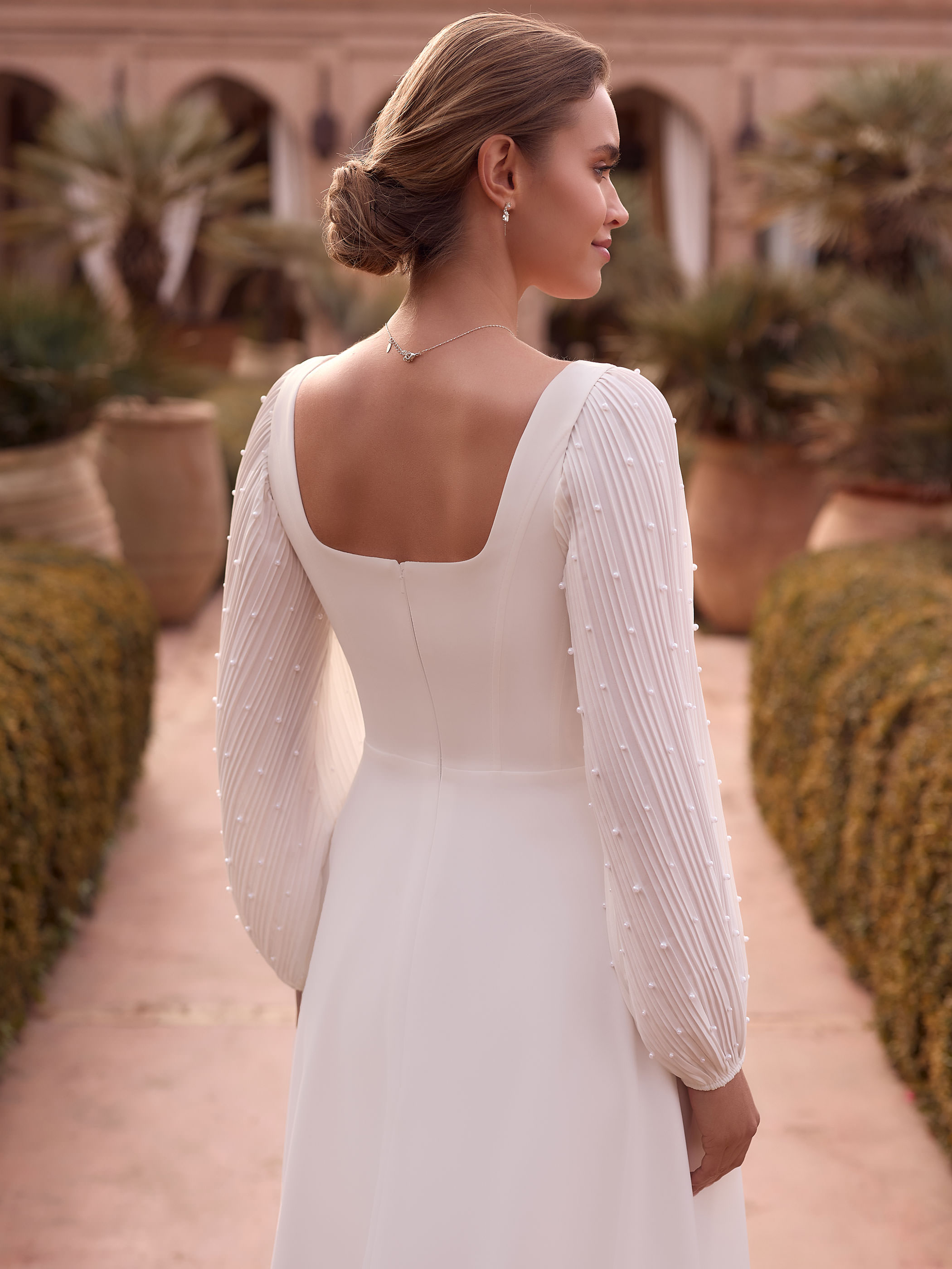 Modern, klar, selbstbewusst: Diese langen, bedeckenden Chiffon-Ärmel aus hochwertigem Chiffon ergänzen ärmellose Brautkleider und machen sie wintertauglich. Mit einer Länge von 61 cm passen sie harmonisch zur Silhouette. Zusätzliche Perlen setzen dezente Akzente und verleihen dem Look Raffinesse. Ideal für Winterkollektionen, elegante Überwürfe oder adaptierbare Zweitlooks.