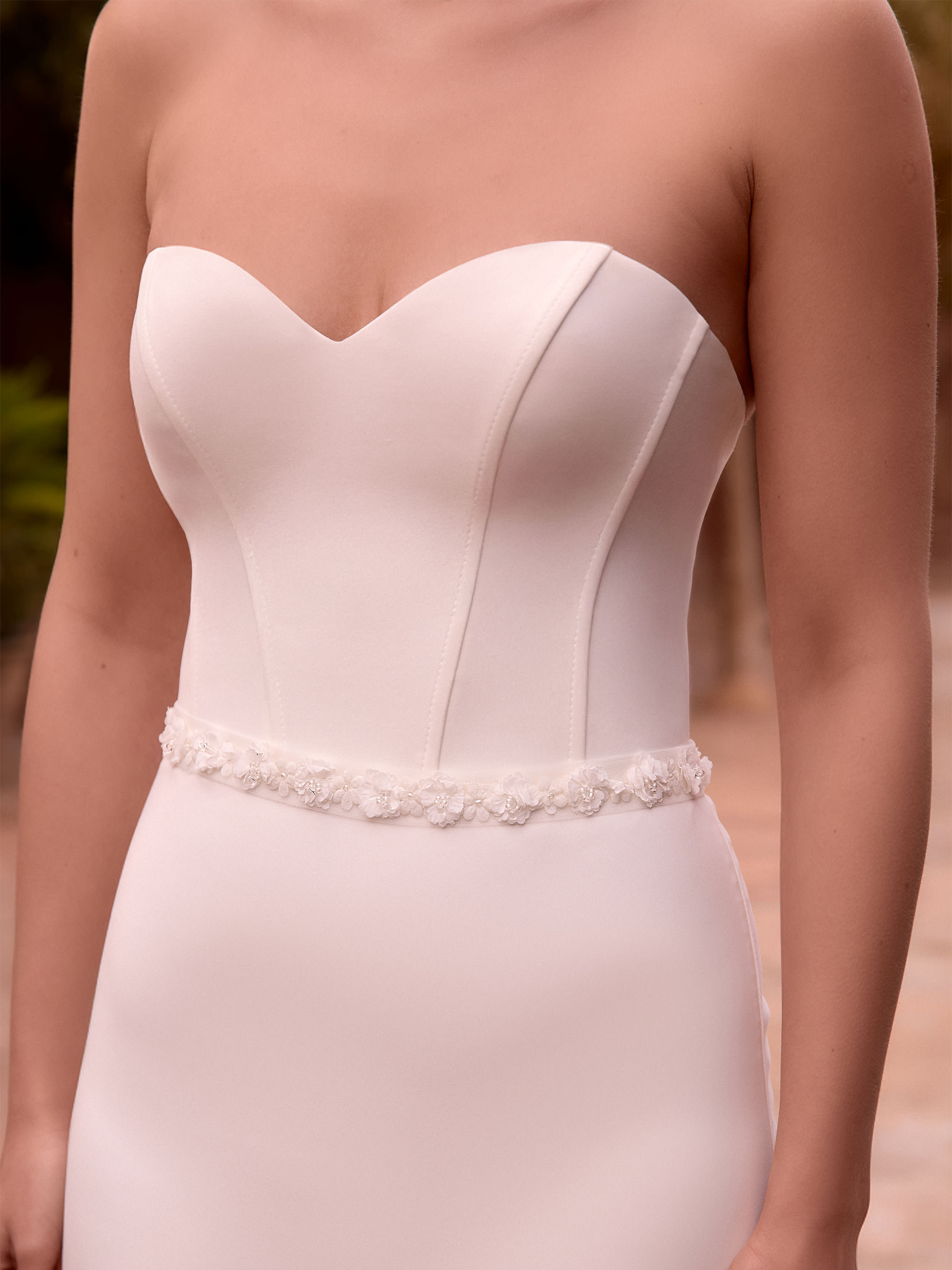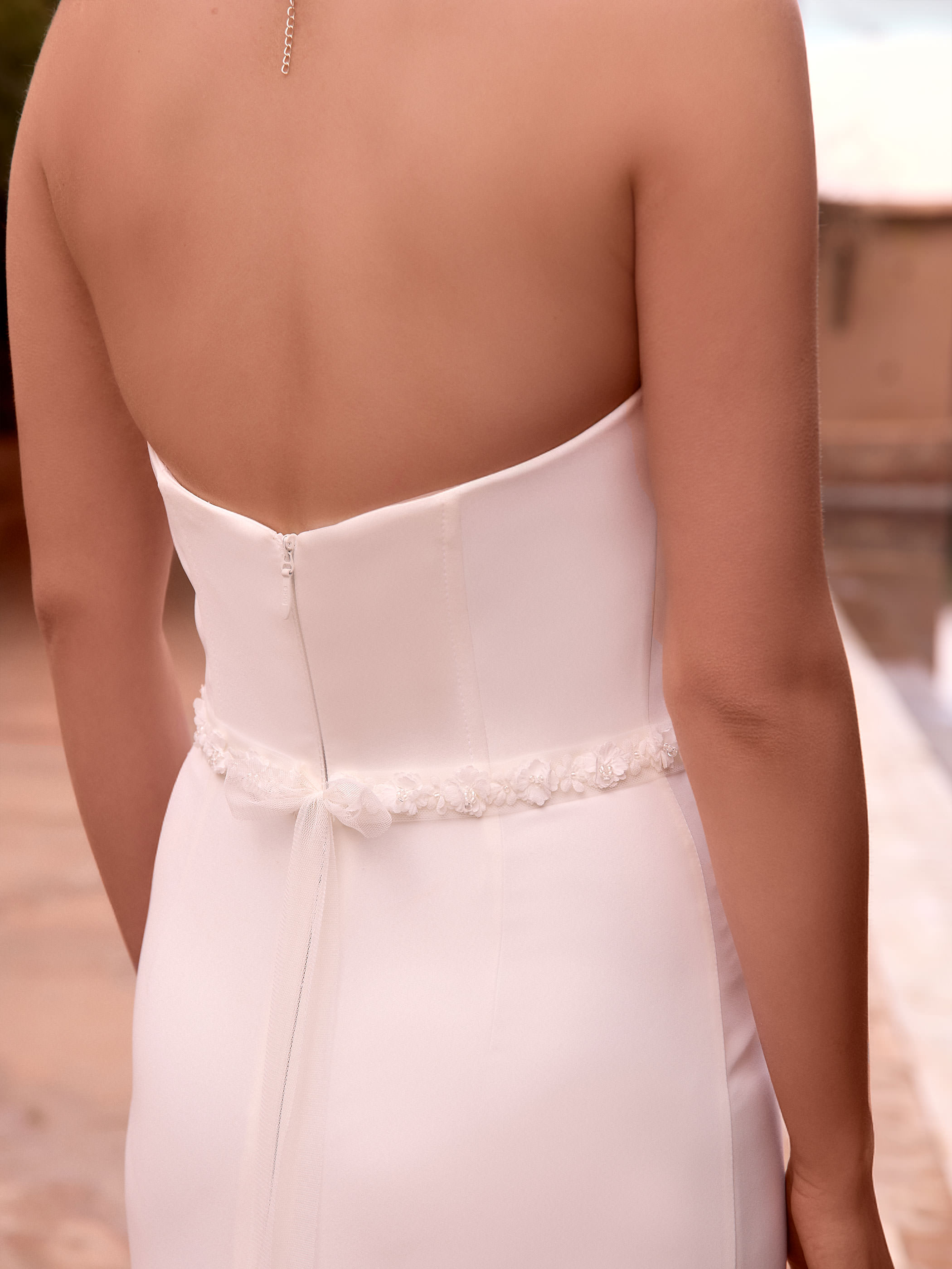 Modern, klar, selbstbewusst: Dieser Tüllgürtel mit 3D-floralem Spitzenbesatz setzt feine Akzente an der Taille. Mit 275 cm Länge und 2,5 cm Breite lässt er sich variabel hinten binden. Sorgfältige Details und plastische Spitze unterstreichen die handwerkliche Qualität. Ideal als Taillenakzent für Brautkleider, für den zweiten Look am Abend oder als elegantes Detail beim Standesamt.