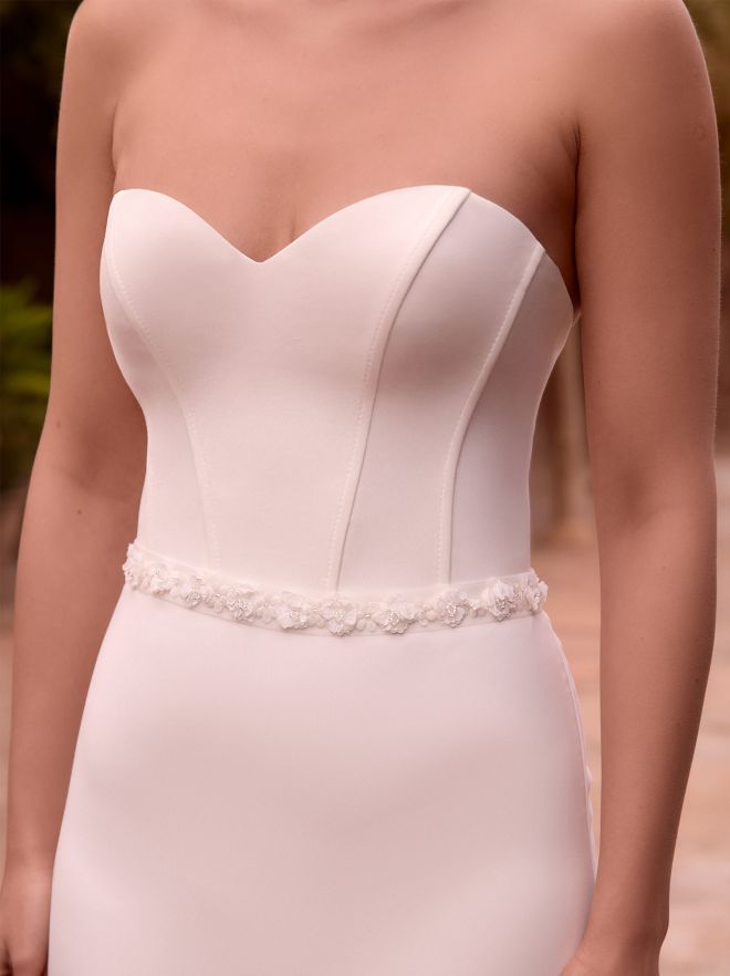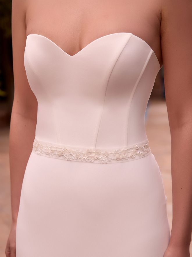Zarter Brautgürtel aus feinem Tüll, geschmückt mit kleinen Perlen. Mit einer Breite von 1 cm und einer Länge von 275 cm lässt er sich individuell am Rücken binden. Die sorgfältige Verarbeitung und die dezenten Details verleihen dem Accessoire eine elegante, zurückhaltende Note.