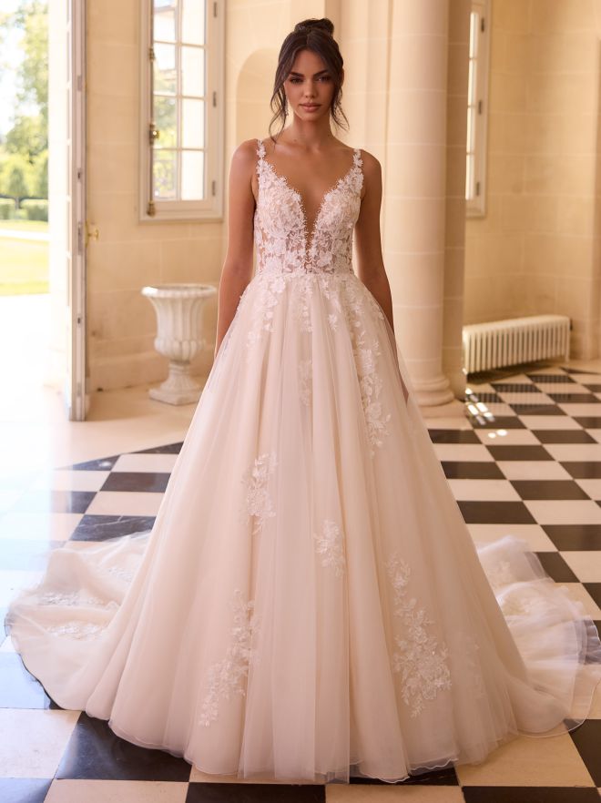 Modern, klar, selbstbewusst: Dieses kurze A-Linien-Brautkleid aus feiner Spitze betont eine natürliche Taille und setzt mit geradem Rückenausschnitt ein frisches Statement. Das ärmellose Design mit 3D-Blumenapplikationen auf dem Oberteil verleiht dem Look feminine Leichtigkeit. Der Rücken schließt mit einem Reißverschluss. Ideal für standesamtliche Trauungen, Sommerhochzeiten oder den zweiten Look am Abend.