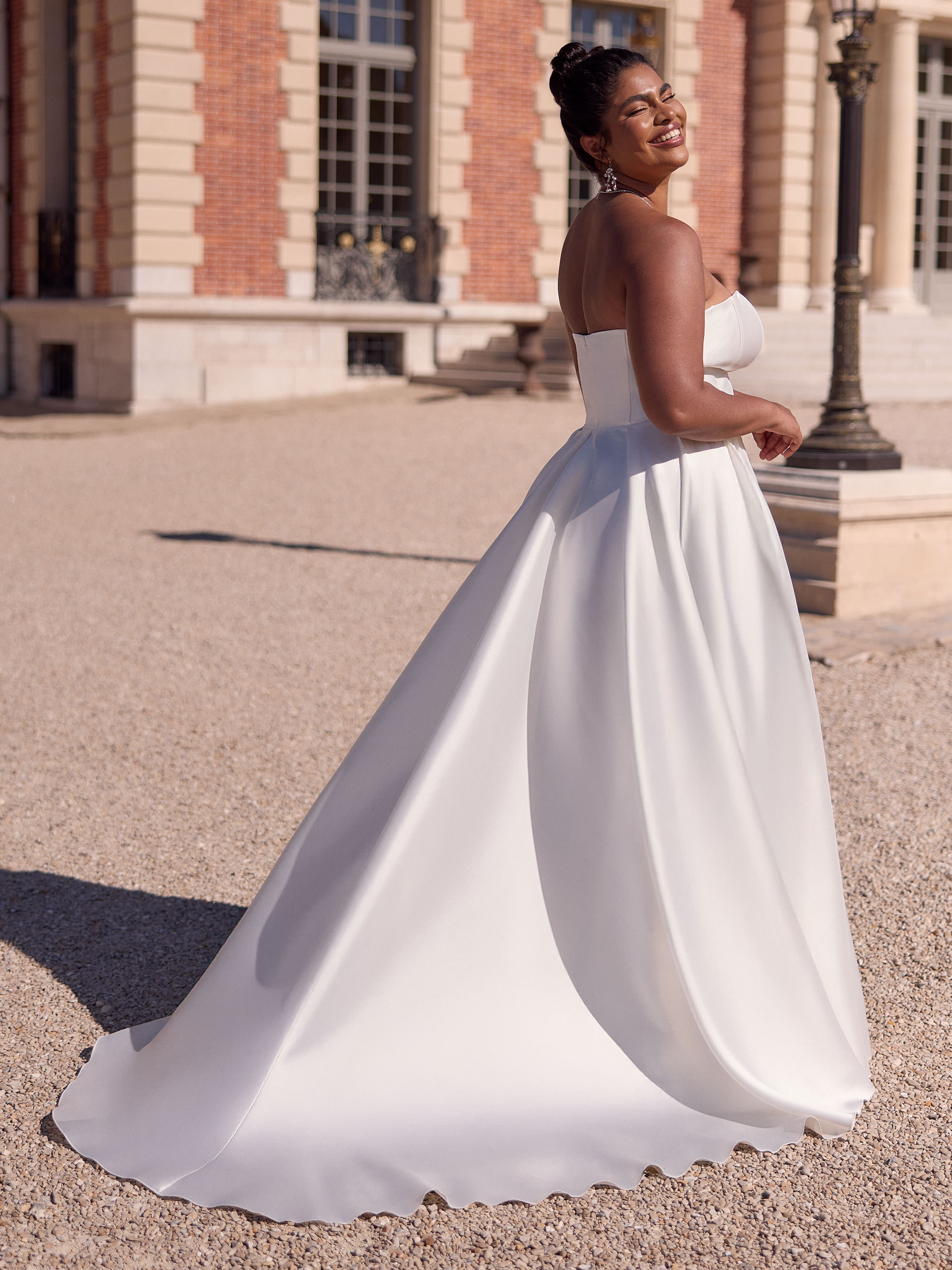 Modern, klar, selbstbewusst: Dieses bodenlange Brautkleid aus edlem Mikado betont eine natürliche Taille und setzt mit offenem Rücken ein stilvolles Statement. Der herzförmige Ausschnitt und der voluminöse Faltenrock verleihen dem Look klassische Eleganz. Der Rücken schließt mit einem Reißverschluss und feinen Knöpfen. Ideal für feierliche Trauungen, elegante Hochzeitszeremonien oder den großen Auftritt am Abend.