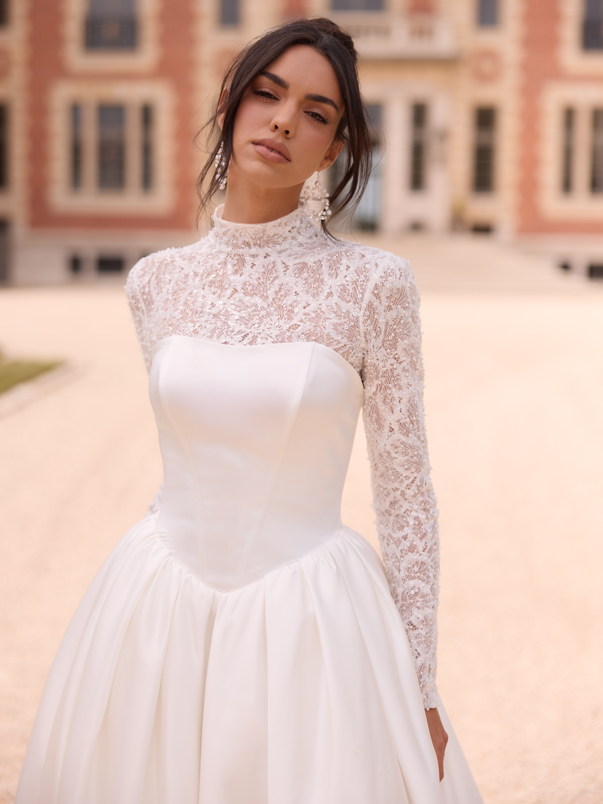 Modern, klar, selbstbewusst: Dieses bodenlange Ballkleid aus edlem Mikado-Satin betont eine elegante Basquen-Taille und setzt mit geradem Rückenausschnitt ein ausdrucksstarkes Statement. Das trägerlose Dekolleté und die Korsettstruktur verleihen dem Look feminine Raffinesse. Die majestätische Schleppe rundet das Design harmonisch ab. Der Rücken schließt mit einem Reißverschluss. Ideal für feierliche Trauungen, klassische Hochzeiten oder elegante Galaveranstaltungen.